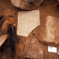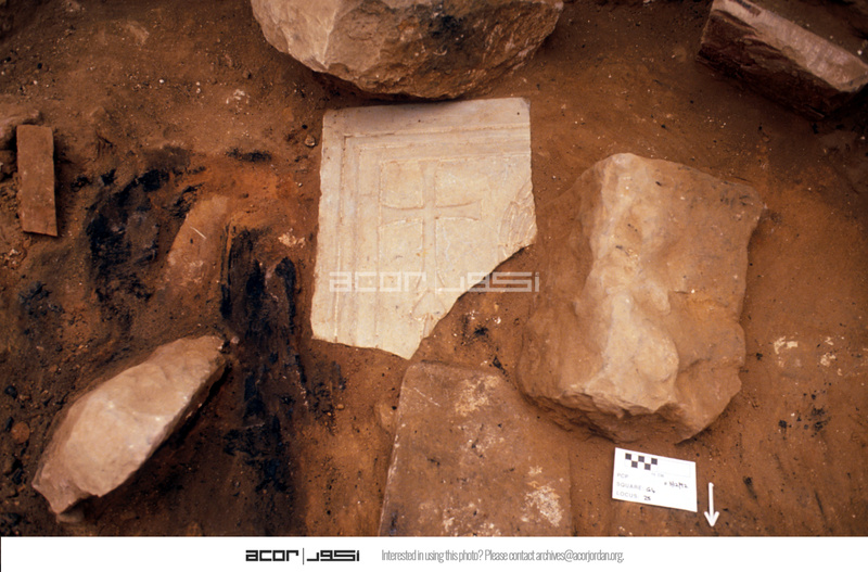 Marble w/cross. In-situ. View to north. - Sq. G4. Locus 25.