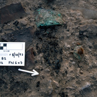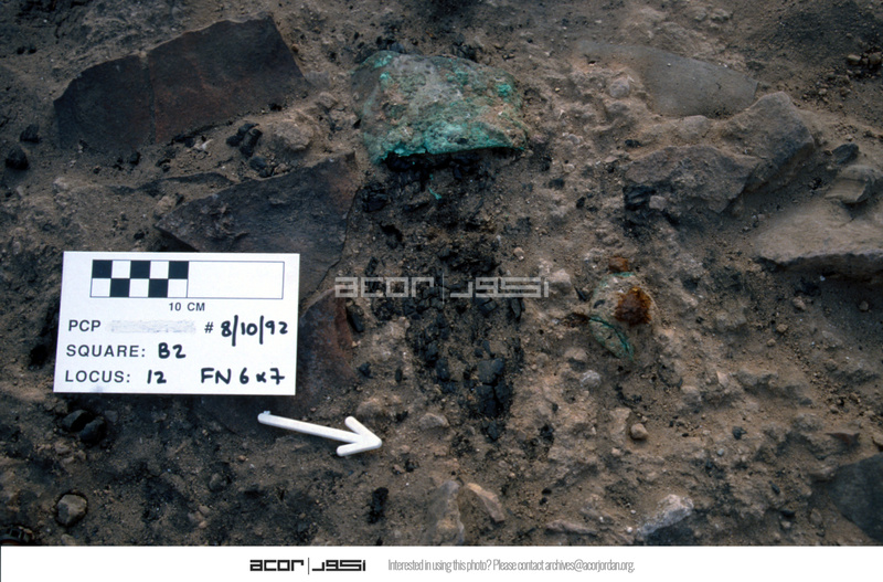 - Close-up view to west of Cu/Cu alloy door hinge in-situ. - Sq. B2. Locus 12/FN6 & 7.