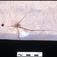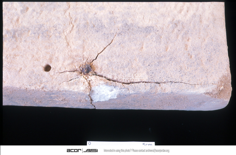 - Marble fragment with iron nail embedded. Pre-conservation. - Sq. F2. Studio. Locuse 22/Pail 62/FN2.