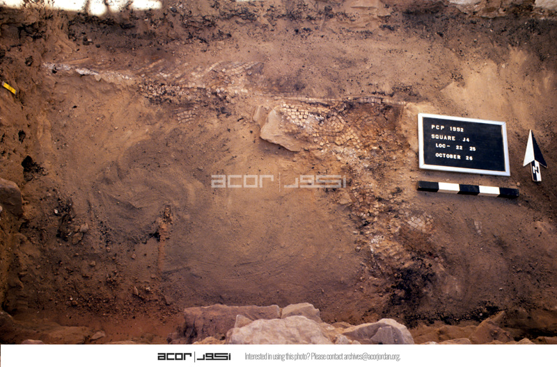 Mosaic damage. Close-up view to north. - Sq. J4. Loci 22, & 25.