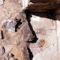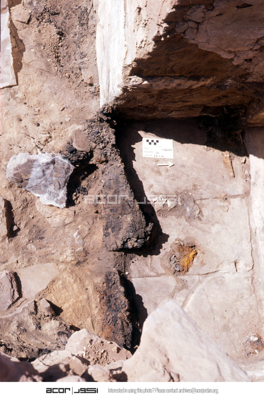 - Close-up of burnt wood & door hinges. Top view to west. - Sq. J4. Loci 23, & 24.