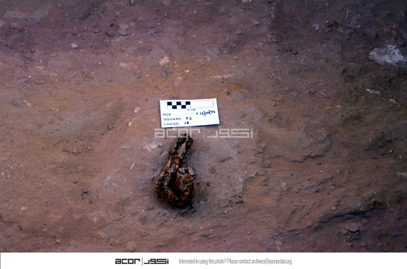 View to north. Close-up of iron object in-situ. CS only. Refer to CS 38/ 22, 23, & 24. - Sq. F2. Locus 18.