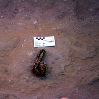 - View to north. Close-up of iron object in-situ. CS only. Refer to CS 38/ 22, 23, & 24. - Sq. F2. Locus 18.