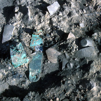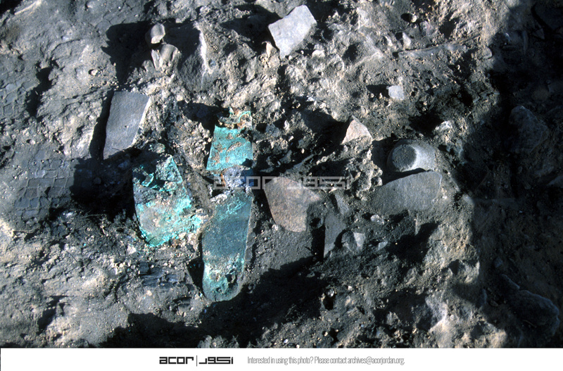 - Close-up view to east of Cu/Cu alloy door hinge in-situ. (taken withour card in frame). CS only. - Sq. B2. Locus 12/FN6 & 7.