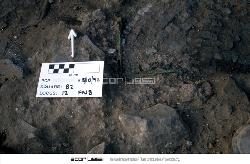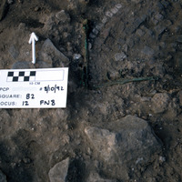 Close-up view to west of Cu/Cu alloy piece. - Sq. B2. Locus 12/FN8.