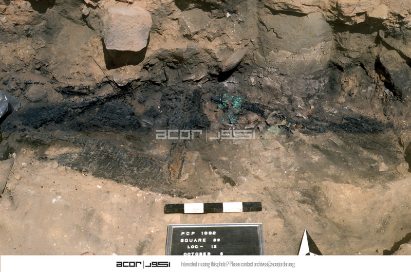 General view of Cu/Cu alloy door hinge and surrounding burnt wooden remains. - Sq. B2. Locus 12/FN1 & 2.