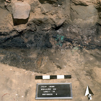 - General view of Cu/Cu alloy door hinge and surrounding burnt wooden remains. - Sq. B2. Locus 12/FN1 & 2.