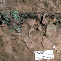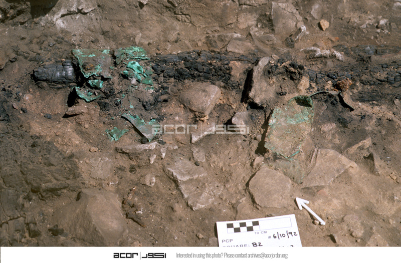 - Close-up of Cu/Cu alloy door hinge in-situ. View to north-east. - Sq. B2. Locus 12/FN1 & 2.
