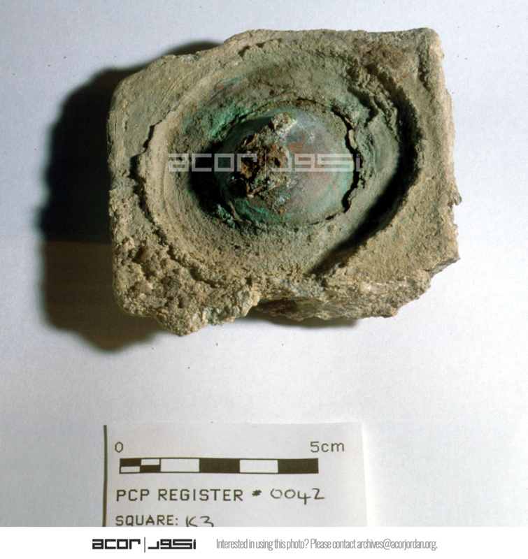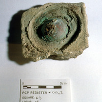 After partial clean. Pb/Cu alloy mount for door hinge. Obverse side.