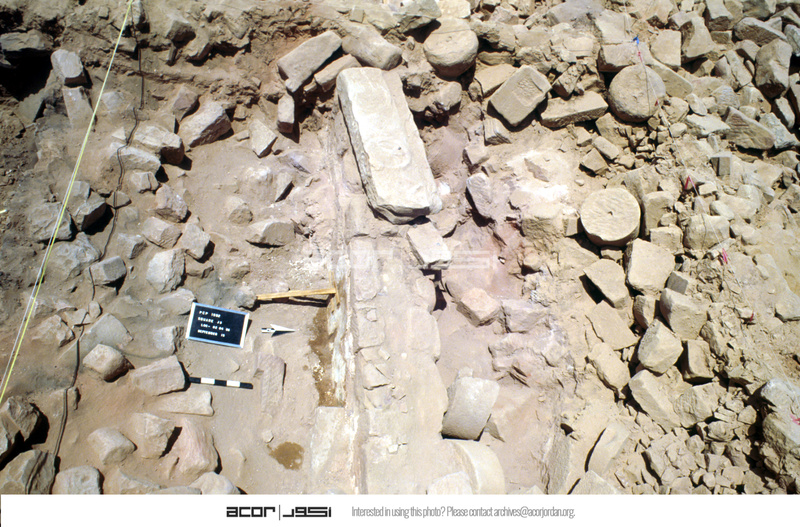 Aerial view to west. - Sq. J3. Loci 02(wall), 04, & 06.