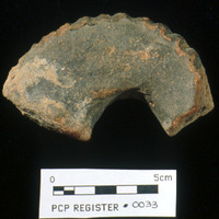 - Pottery ibex horn(frag). Side view. - Sq. H4. Studio. Locus 00/Pail 01. Reg #PCP.0033.