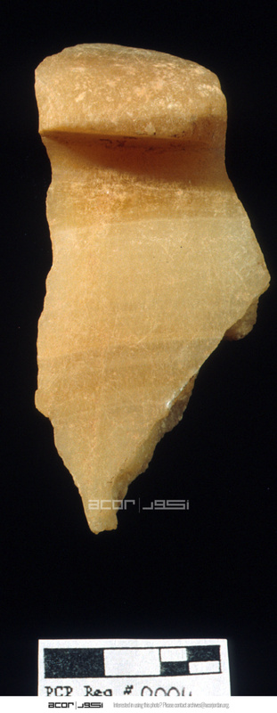 - Alabaster vessel base(fragment). Outer view. Sq. B1. Studio. Locus 13/Pail22. Reg #PCP.0004