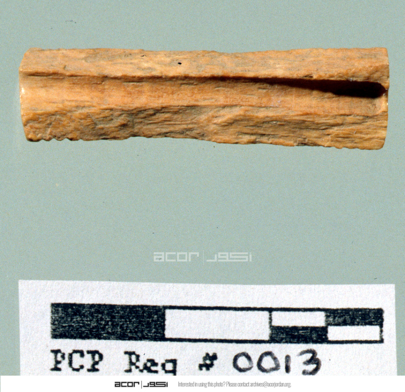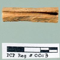 - Carved bone object. Inner view. Sq. B1. Studio. Locus 14/Pail 34. Reg #PCP0013