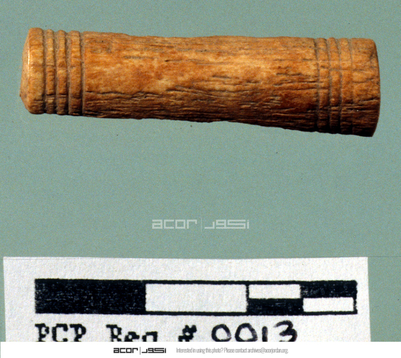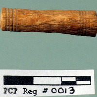 - Carved bone object. Outer view. Sq. B1. Studio. Locus 14/Pail 34. Reg #PCP0013