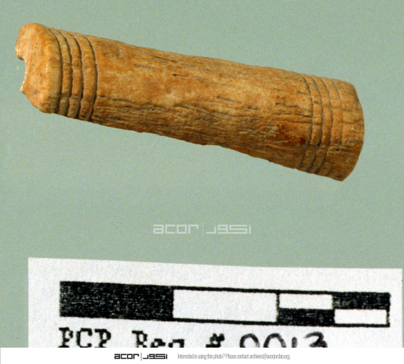 Carved bone object. Oblique view. - Sq. B1. Studio. Locus 14/Pail 34. Reg #PCP0013