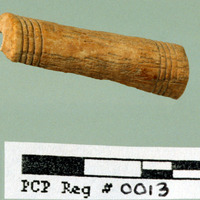 - Carved bone object. Oblique view. - Sq. B1. Studio. Locus 14/Pail 34. Reg #PCP0013