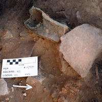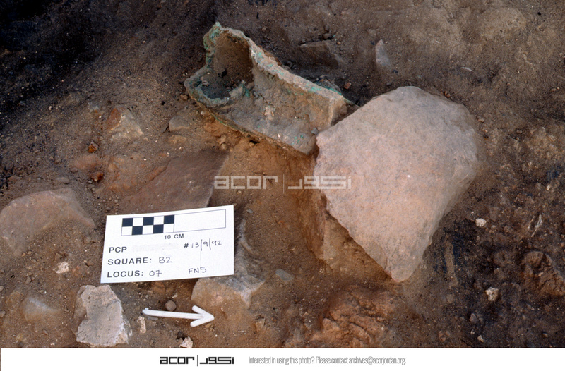 Close-up view to west. Cu/Cu alloy door hinge. - Sq. B2. Locus 07/FN4.