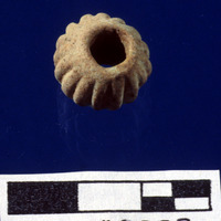 - Bead incised with vertical grooves. - Sq. A1. Studio. Locus 19/Pail 43. Reg #PCP.0023.