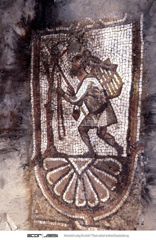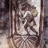 Sq. B1. Close up of mosaic depicting a fowler and his falcon for publication.