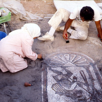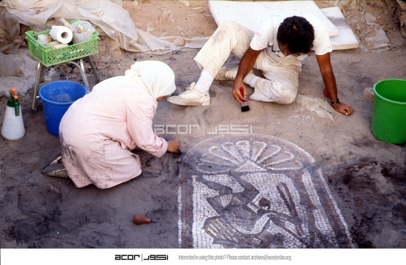 Tom & Fatma cleaning off mosaic in B1 for photograph. - Sq. B1.