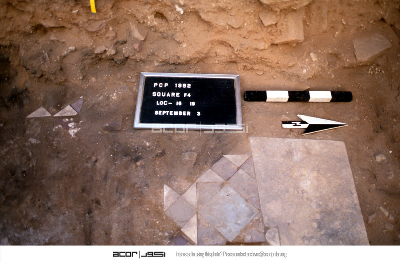 Marble floor tiles. View to west. - Sq. F4. Loci 16 & 19.