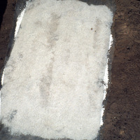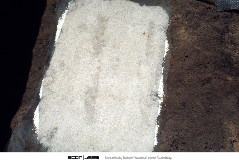 View to east. Backfilling of uncovered mosaic and marble pavement with plastic netting and perlite. Roll 3 - - Sq. B1. SE corner of square.