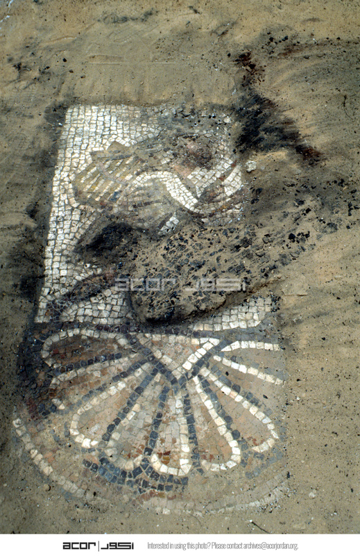 South aisle. View to east. Half shell motif and figure with basket on his back. Roll 3 - - Sq. B1. Trial uncovering of mosaic pavement