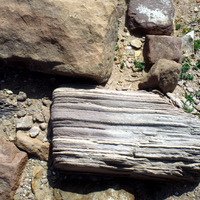 Detail of sandstone ashlar block in wall of central apse. View to east. Pre-application of Wacker O.H. consolidant. Roll 1 - 36.