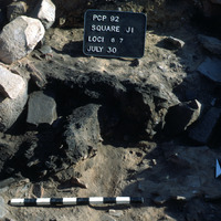 View to north. - Sq. J1. Loci 06, 07 & burnt wood.