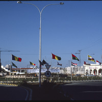 International flags flying in traffic circle