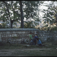Children digging along wall