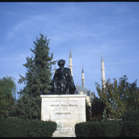 Statue of the architect Sinan with minarets of Selimiye Mosque