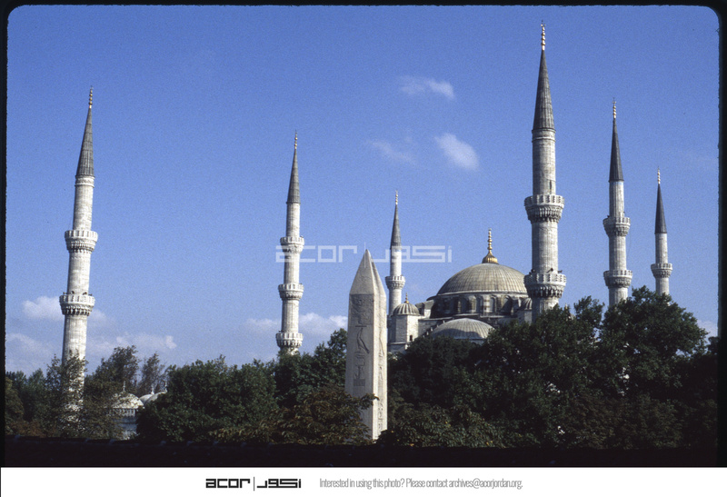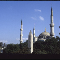 Minarets and dome of Sultan Ahmed Mosque with obelisk