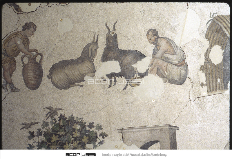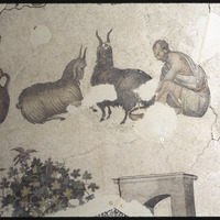 Detail of mosaic depicting men milking a goat