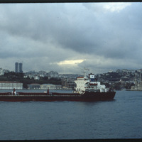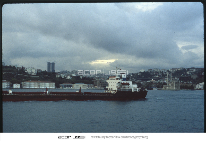 Ship in Bosphorus with Istanbul skyline and Ortaköy Mosque in background