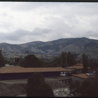 View of hills over modern buildings
