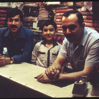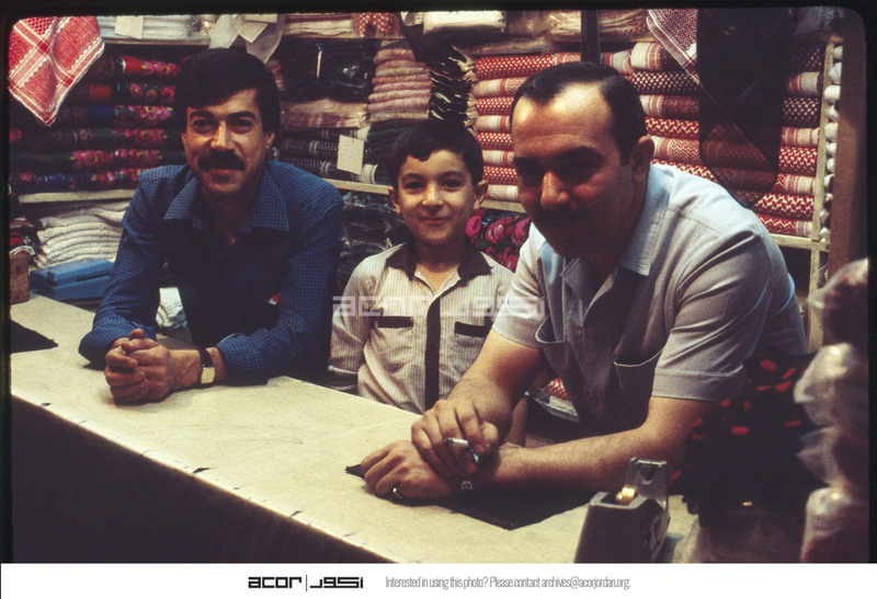 Two men and a child in textile shop in the old market of Aleppo