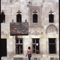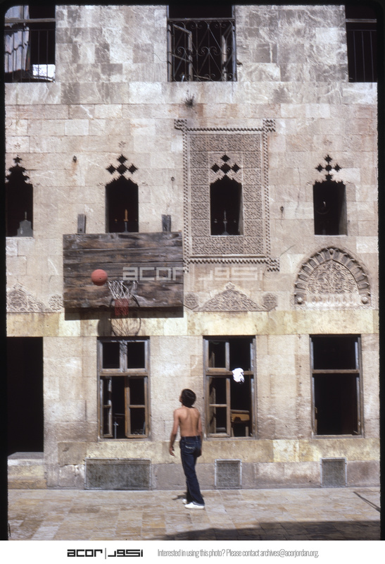 Boy playing basketball in Beit Ghazaleh courtyard at Al-Jdayde quarter of Aleppo