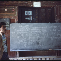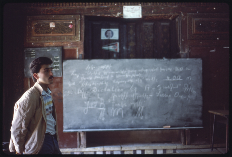 Unidentified man in Beit Ghazaleh classroom with Armenian text on chalkboard at Al-Jdayde quarter of Aleppo