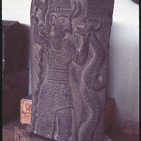 Detail of relief on three sided stele depicting man and snake in Aleppo Museum