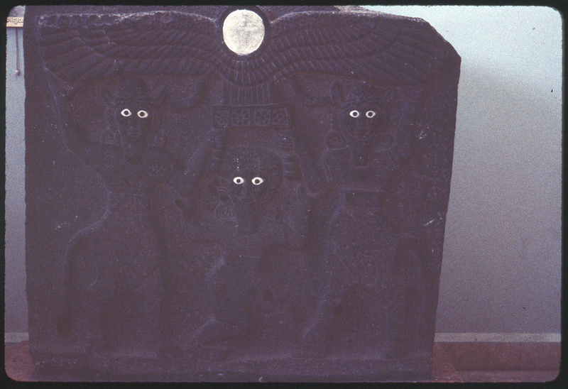 Relief depicting Gilgamesh between two demigods supporting the sun from Tell Halaf in Aleppo Museum