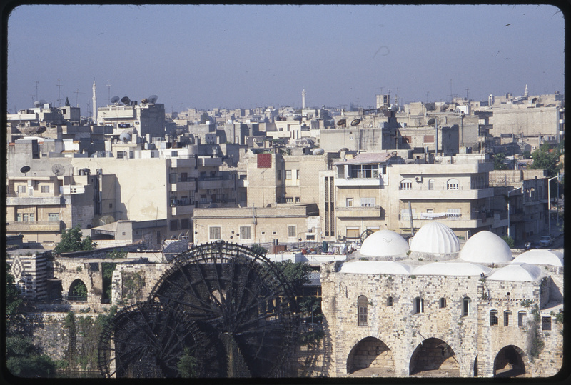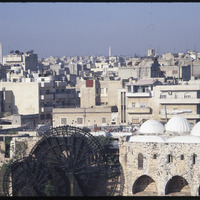 View of Hama with norias in foreground and Nur al-Din Mosque