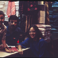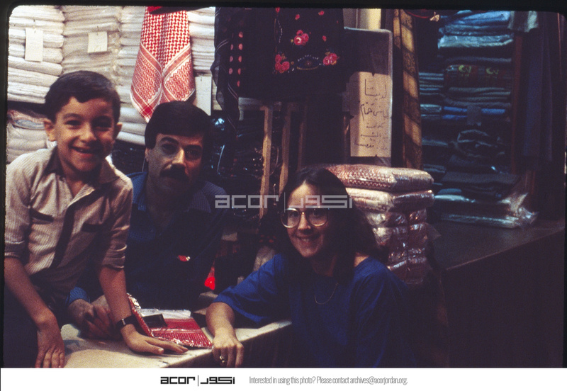 Barbara Porter with a man and a child in textile shop in the old market of Aleppo