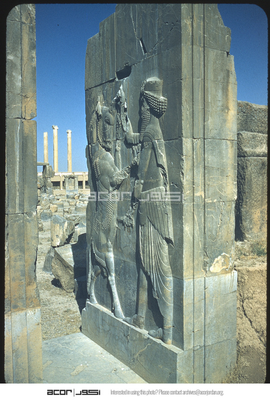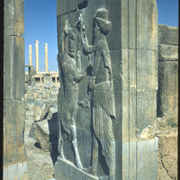 Door of 100 column hall, Xerxes fighting a monster description: top: monster -tail of scorpian, feet of eagle, wings of eagle, head of lion, horn of bull