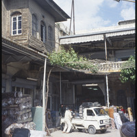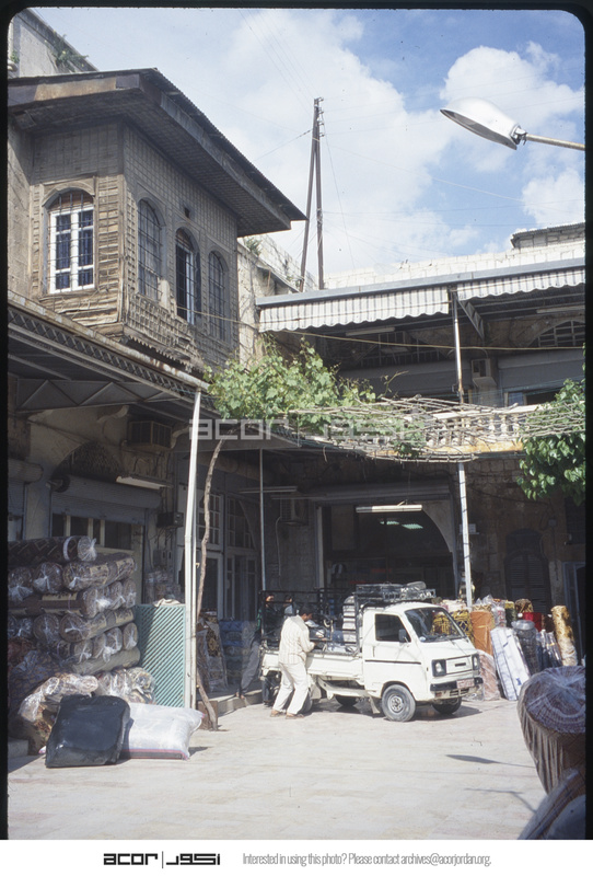 Facade of historic building in the old market of Aleppo showing windows, a mashrabiya, and workers
