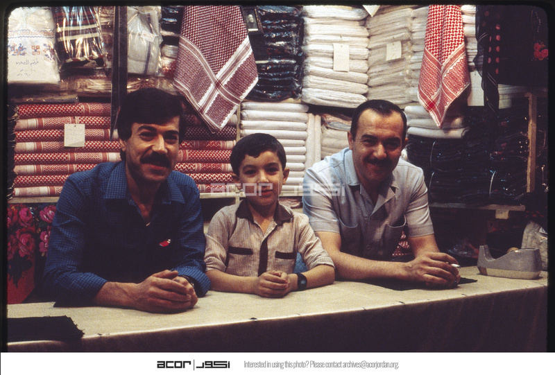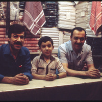 Two men and a child in textile shop in the old market of Aleppo