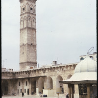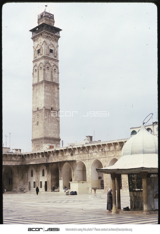 View of the courtyard of the Great Mosque of Aleppo showing the ablutions fountain and the minaret