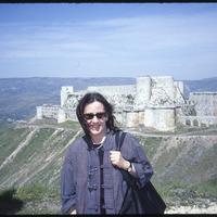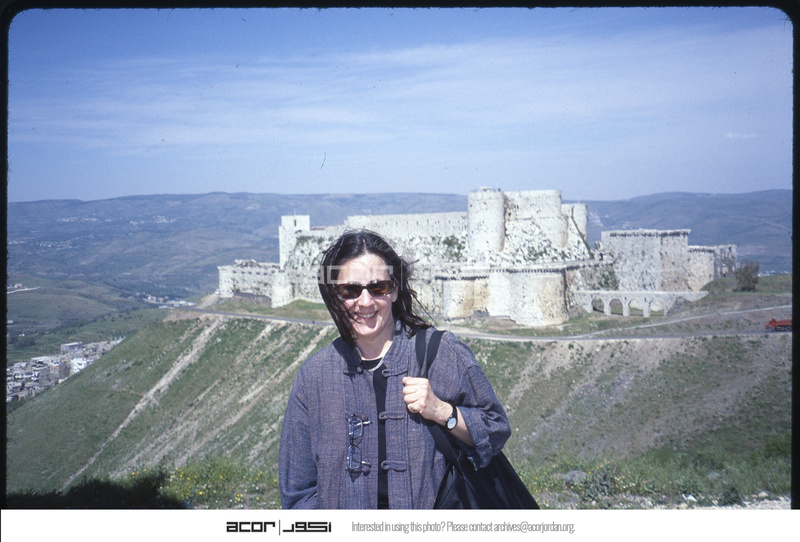 Barbara Porter posing with Krak des Chevaliers in background