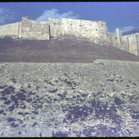 View of a wall along side of Aleppo's citadel, with a side of the entrance