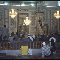 People sitting near minbar and mihrab of the Umayyad Mosque